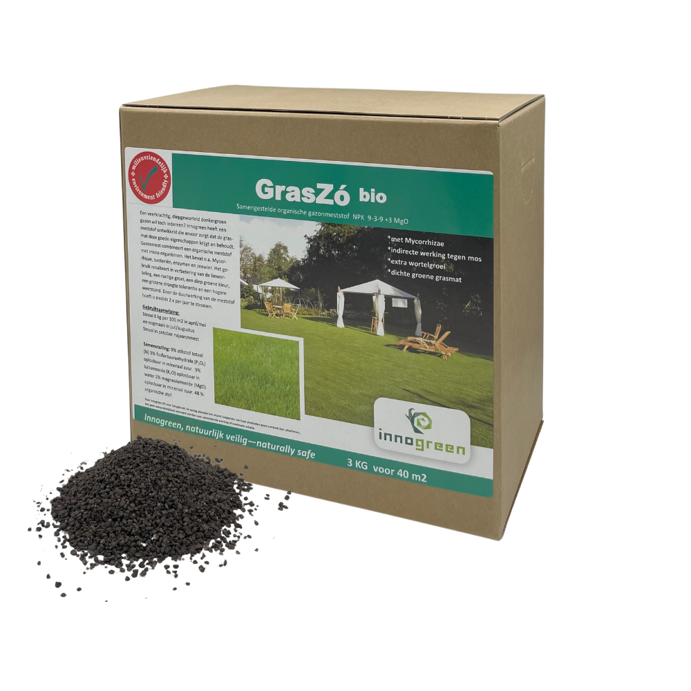 Met GrasZó bieden we een complete gazonmeststof voor het siergazon en speelgazon. Onze GrasZó combineert de beste ingrediënten voor een organische gazonmeststof met de beste micro-organismen en humuszuren in één product. Innogreen GrasZó zorgt voor gezonde groei en geeft een diepgroene kleur. De toegevoegde micro-organismen voeden en versterken het bodemecosysteem. Zo wordt voeding gegeven en de weerstand van de grasmat verhoogd. Gebruik GrasZó in het voorjaar en de zomer voor een optimaal resultaat. Gebruik Vabomix2 als najaarsmest voor het gazon en maak gebruik van onze RoboGazon meststof wanneer een robotmaaier wordt ingezet.