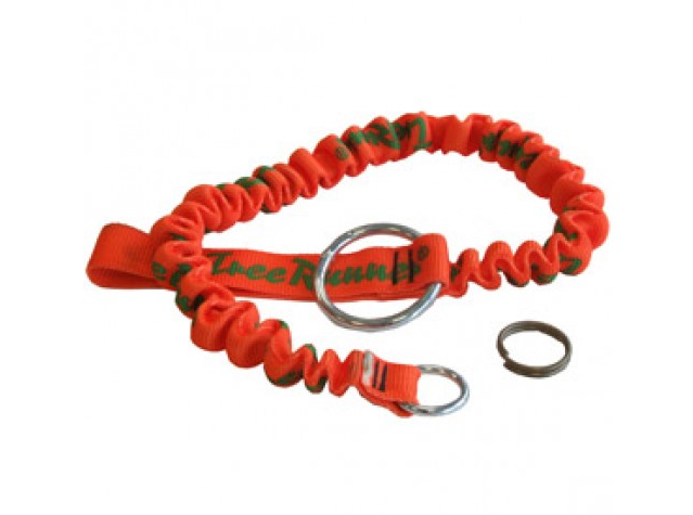 Elastische motorzaagstrop. De zaag kan d.m.v. een stalen ring eveneens kort aan de gordel worden opgehangen. Bij deze strop is de beveiliging ingebouwd d.m.v. een splitring die opengaat bij een te grote belasting. Deze wordt met een karabijnhaak aan de gordel gekoppeld.