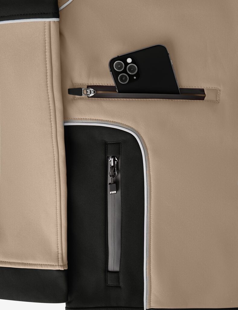 FHB-membraan optimale bewegingsvrijheid door elastisch bovenmateriaal luchtdoorlatend winddicht en waterafstotend (10.000 mm waterkolom) waterdichte ritsen reflecterende paspels 2 zijzakken + gsm-vak 1 binnenzak afneembare capuchon
